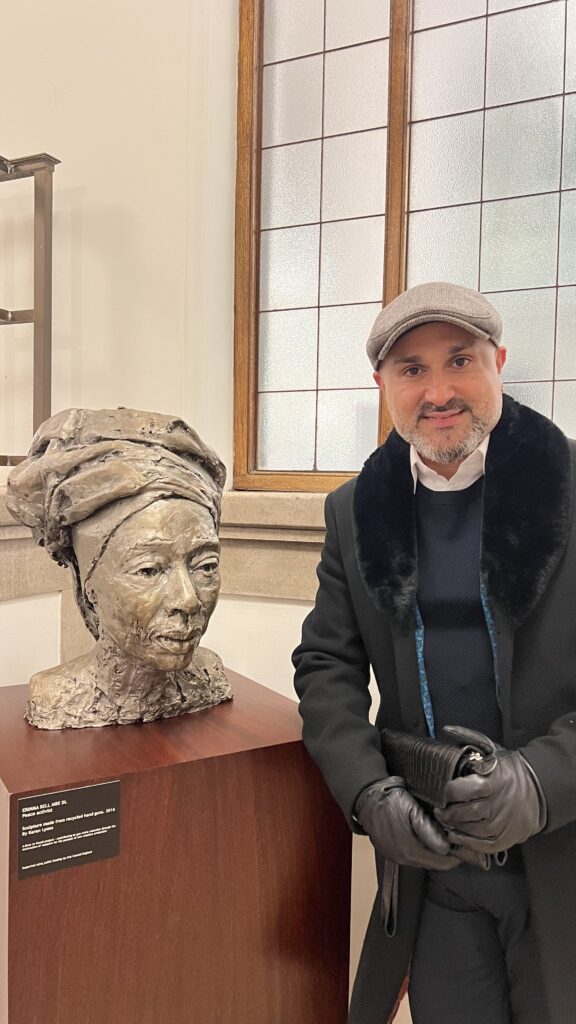 NQ reporter Faraz Arian with a bust of Erinma Bell | Credit: Faraz Arian